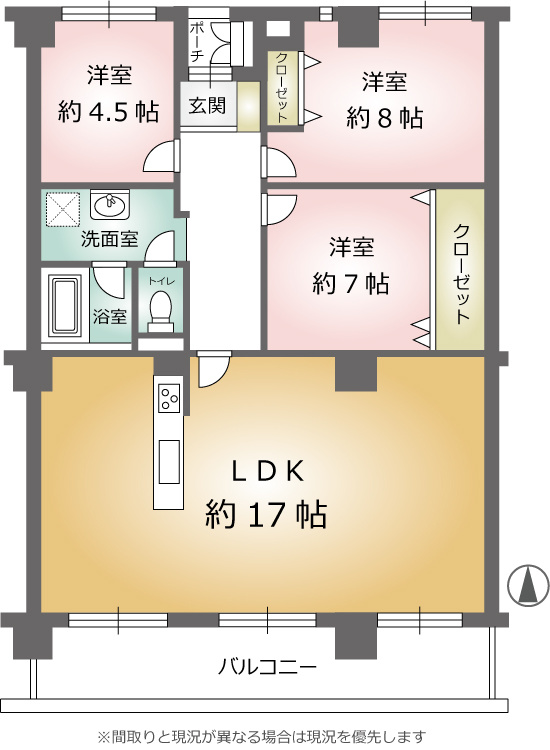 【間取り】南向きでリビング広々約17帖 暮らしやすい3LDKの間取りです