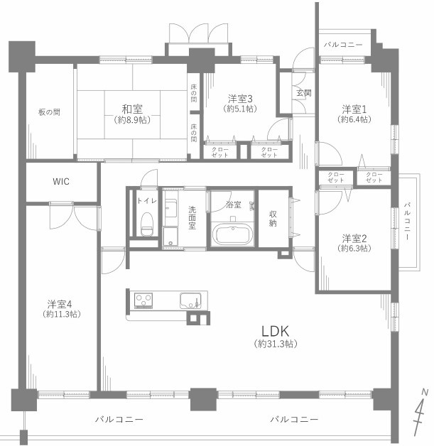 LDK 31.3帖 1室 / 和室 8.9帖 1室 / 洋室 11.3帖 1室 / 洋室 6.4帖 1室 / 洋室 6.3帖 1室 / 洋室 5.1帖 1室 / |