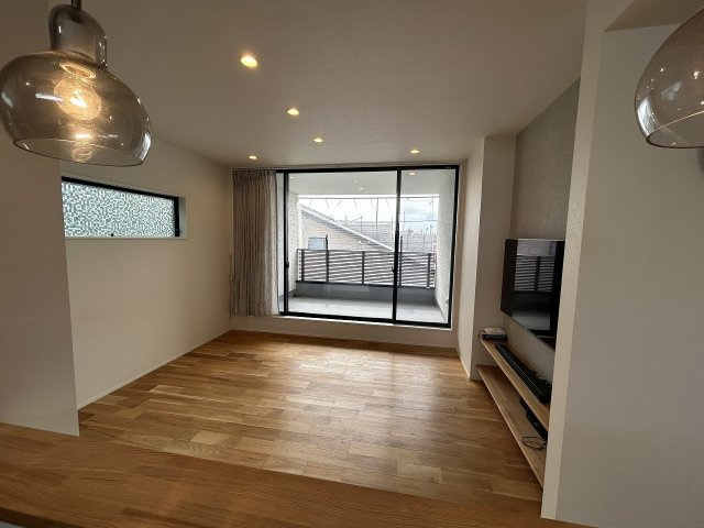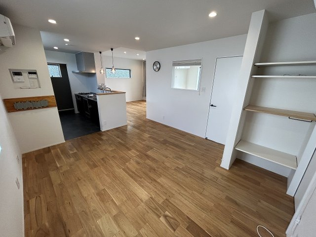 【居間・リビング】リビング22.5帖と広々大空間!収納スペース豊富でおしゃれなL字型、ダウンライトも雰囲気があります☆